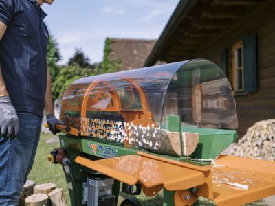 Zamknąć klapę i proces łupania marsz!Po zamknięciu osłony ochronnej z poliwęglanu, automatycznie uruchamia się proces rozłupywania – nie potrzeba dodatkowych czynności ręcznych, nie ma obsługi 2-ręcznej. Po umieszczeniu kłody drzewnej widzą Państwo jak na dłoni cały kanał łupania i mają wolną rękę dla następnego polana drewna.